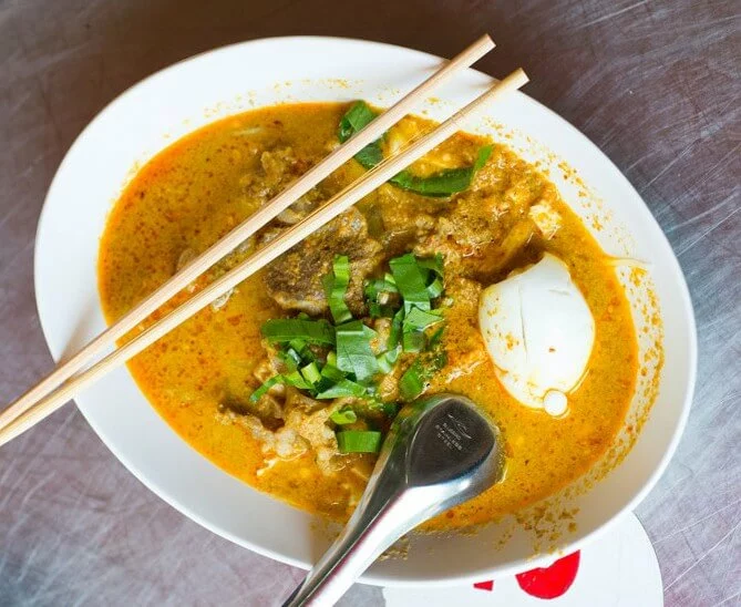 Literally “curry noodles,” this dish takes the form of thin rice noodles served in a fragrant, often sweet, coconut milk-based curry broth. As the dish is served almost exclusively by Thai Muslims, it may include either beef or chicken, but never pork. Other common ingredients include diced tofu, a hard-boiled egg, and bean sprouts. A bowl is garnished with chopped cilantro, deep-fried shallots, ground roasted peanuts, and diced preserved radish, and is served with the usual noodle condiments, occasionally supplemented with a slice of lime.